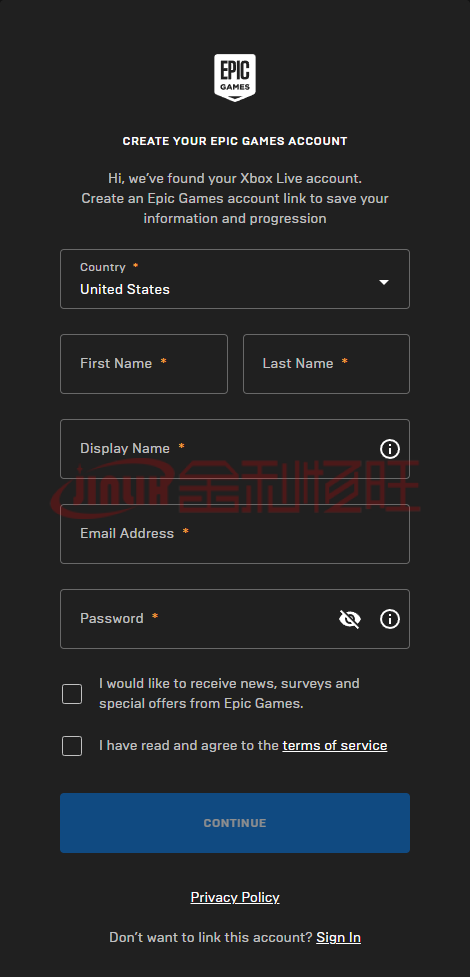 請注意:?如果您沒有看見如上圖所示的頁面,這代表您的賬戶上并沒有《堡壘之夜》的游玩進度。請檢查您是否使用了游玩《堡壘之夜》的主機或平臺的 / 賬戶用戶名密碼進行登錄。 - 填寫所有需要填寫的欄位。