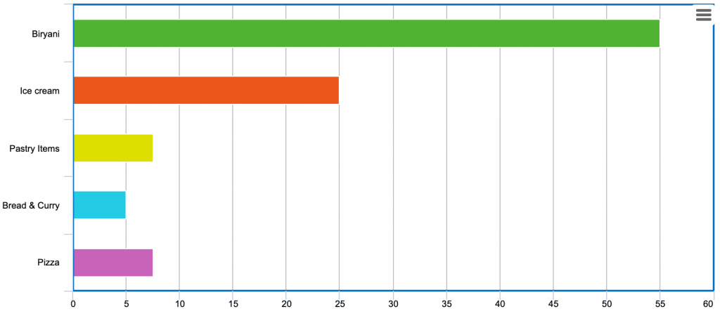 這與現在溫和地呈現給觀察者的信息相同。除了顯示個別價值外,這個圖表使我們能夠快速比較每種食物的受歡迎程度,甚至比較連續食物之間價值的相對差異。同樣的數據本可以通過表格獲得,但我們的大腦在處理圖像方面比破譯文本更好。