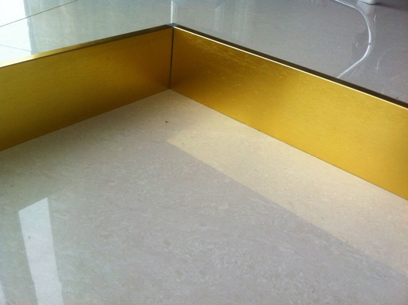 鈦金色不銹鋼踢腳線是怎么制作的?鈦金色不銹鋼踢腳線就是用鈦金色的不銹鋼板,經過刨槽折彎工藝,加工而成。