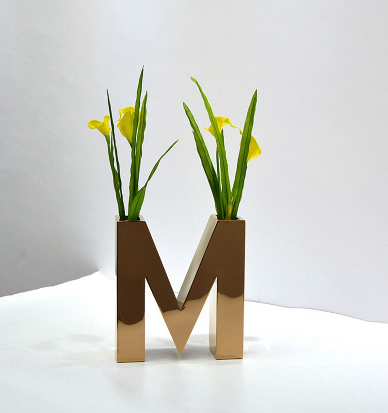 北京金利恒旺公司是一家專業(yè)的不銹鋼花瓶生產(chǎn)廠家,地址是在北京市大興區(qū)長子營鎮(zhèn)。有剪板折彎機(jī),表面處理設(shè)備,可定制加工各種形狀,各種顏色的金屬花瓶。我們注重產(chǎn)品細(xì)節(jié)打磨,專注高檔不銹鋼制品的設(shè)計(jì)研發(fā),只為您提供一個(gè)完美無缺的產(chǎn)品。上圖的M字形不銹鋼花瓶造型獨(dú)具匠心,富有設(shè)計(jì)感,特別適合現(xiàn)代和后現(xiàn)代的裝修風(fēng)格。另外我們也可以做成別的字母形狀的。價(jià)格大概是200元一個(gè)。
