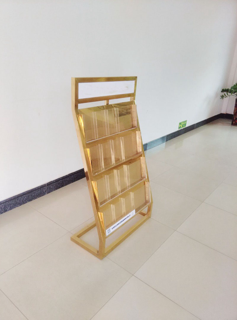 一般的不銹鋼展示架都是銀色的,很普通,但是這款由北京金利恒旺公司加工的不銹鋼展示架卻是金色的,顯得很獨一無二,高端大氣上檔次。它和普通的展示架制作工藝都差不多,都是先用不銹鋼管切割焊接而成,再經(jīng)過車間師傅的精心打磨拋光,最后的一個步驟就是鍍鈦工藝,也就是上色的過程。就是把這個展架放進鍍鈦爐里面去進行鍍鈦金的一個過程。